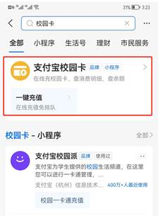 (1)支付宝充值:打开支付宝搜索“校园卡”或“校园派”,选择“支付宝校园卡”,如图所示,选择太阳成集团tyc234cc,输入姓名、学号进行支付,支付成功后等2分钟自动到账,可在支付宝校园卡查询余额。