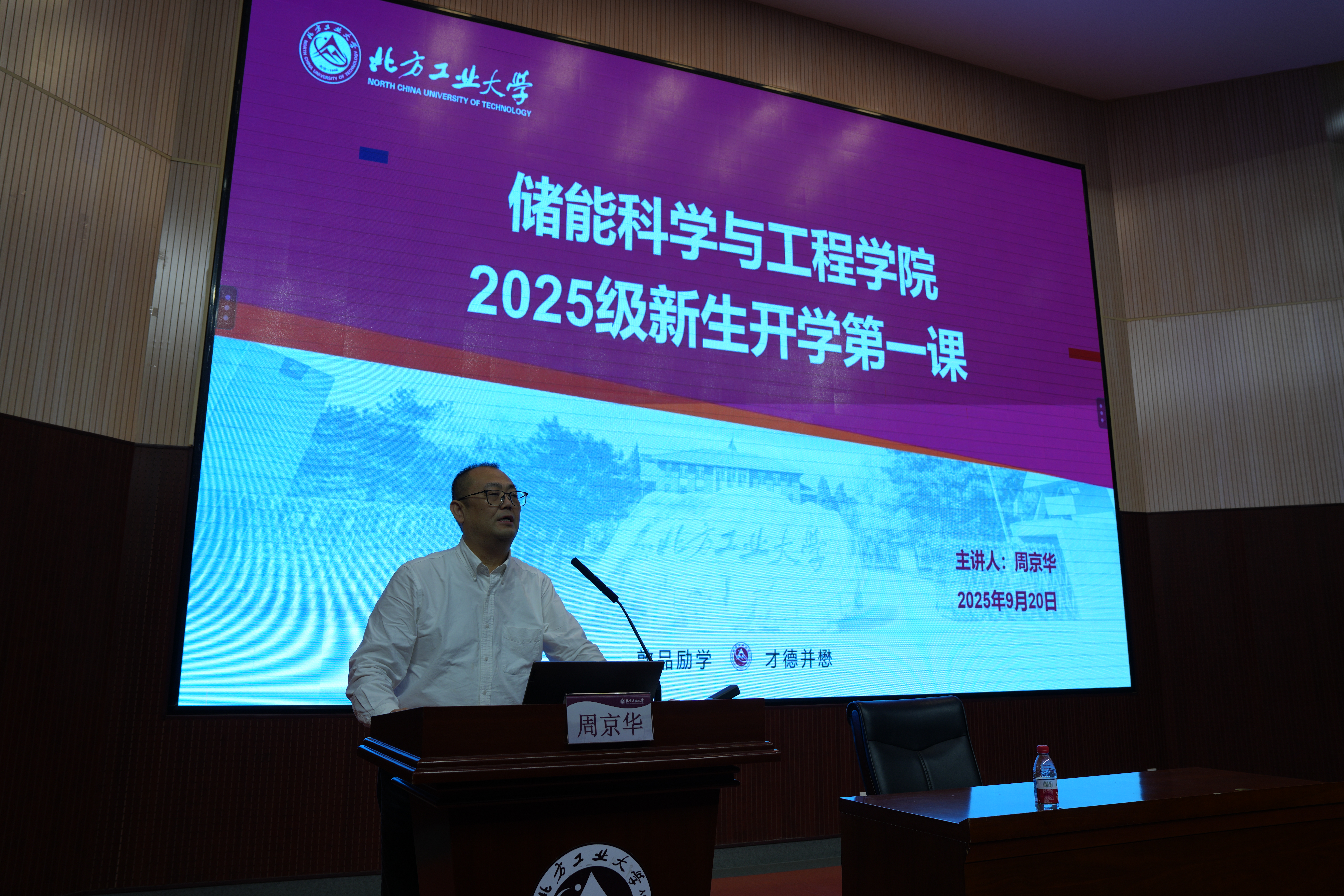公司副经理周京华为全体新生讲授“开学第一课”。他系统介绍了公司的建设历程与发展现状,强调公司作为北京高校中唯一的太阳成集团tyc234cc,已构建起“本硕贯通”的一体化培养体系,形成了一支以国家级、省部级人才为骨干的高水平团队队伍,专业特色鲜明、科研优势突出。他勉励同学们要立鸿鹄之志,将个人理想融入国家“双碳”战略;要勤学笃行,夯实专业基础,培养创新思维;要善用公司优质平台,勇于实践探索,努力成长为德才兼备、堪当大任的储能领域卓越人才。随后,储能系系主任温春雪老师详细解读了《本科学籍管理规定》,为新生明晰学业规划与毕业要求。